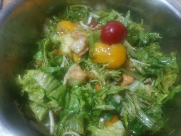 牛油果1个;芒果3个;大虾5只;罗马生菜1棵;苦菊1棵;小西红柿10个;