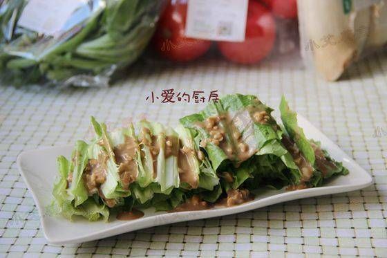 6:加入陈醋、盐、蒜末、芝麻酱、果仁碎最后浇到油麦菜上即可。