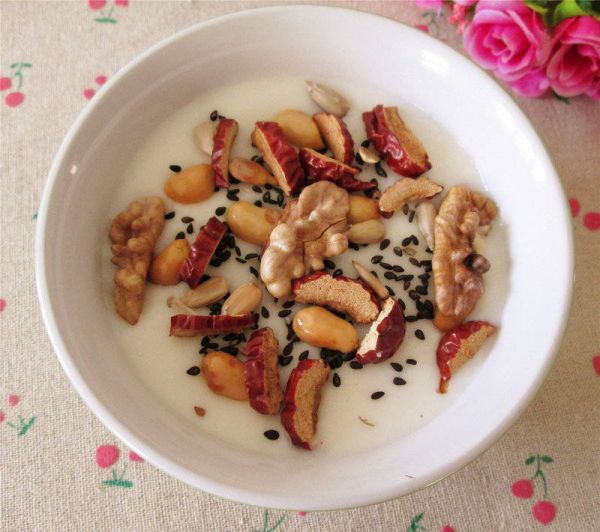 黑芝麻1勺;清水400克;核桃2个;花生10粒;瓜子1撮;红枣2个;