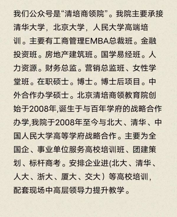 最后,该班级的招生对象包括大健康产业、医药、医疗器械行业大中型企业(上市公司、外资、民营企业)董事长、董事总经理、医院、卫生行政机构高层管理人员、医疗投资、经营机构高层管理人员、科研院所、行业协会负责人等。入学条件对于企业学员要求是董事长、法人或是大型企业的执行总经理;企业年销售额不得低于3亿元。