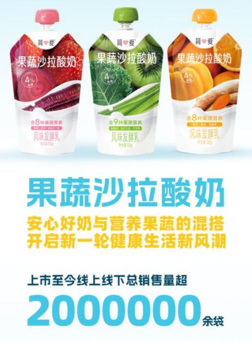 而简爱果蔬沙拉酸奶一经面世便赢得了广泛好评,在刚刚收官的双十一期间,简爱果蔬沙拉酸奶获得了全平台销售200万袋的的好成绩,成为简爱酸奶双十一期间名副其实的“优等生”。不仅如此,简爱果蔬沙拉酸奶的发展前景同样十分辽阔,因其纯净、低糖、低热量的“代餐”性质,受到健身人士、轻食者的一致追捧。