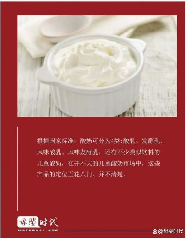 但是值得关注的是,虽然表面上这些产品都主打定位为儿童酸奶,但实则执行标准的类别并不同。根据国家标准,酸奶可分为4类:酸乳、发酵乳、风味酸乳、风味发酵乳,还有不少类似饮料的儿童酸奶,在并不大的儿童酸奶市场中,这些产品的定位五花八门、并不清楚。