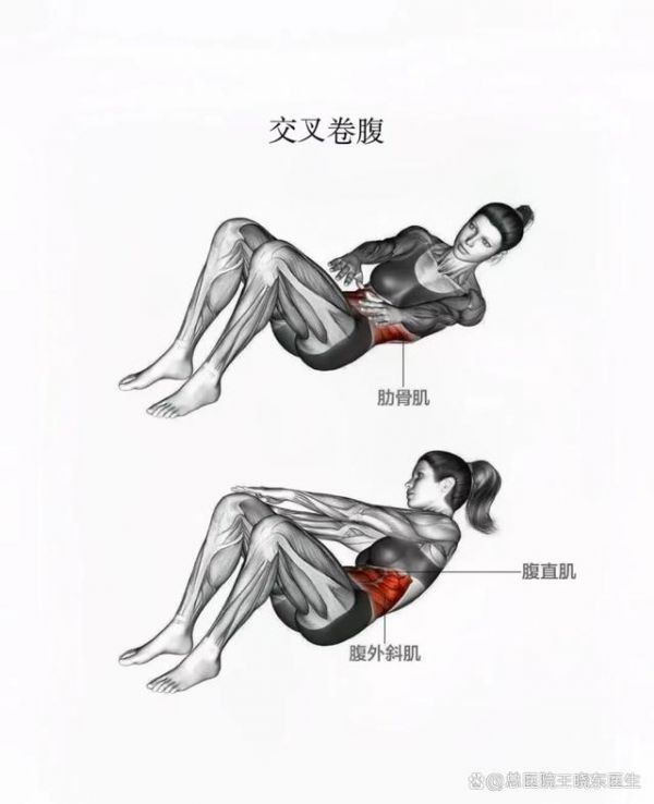 动作要领:身体躺平,腰臀紧贴地面,双脚抬起呈90度。利用核心的力量将肩膀带动向右旋转,右脚弯曲碰至左手手肘,腿不触碰地面,换边动作重复。