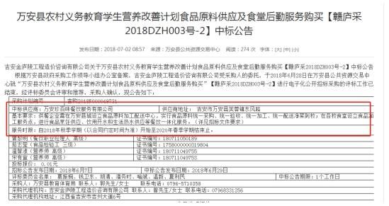 万安县人民政府网站显示,今年6月底,珍百味中标了万安县农村义务教育学生营养改善计划食品原料供应及食堂后勤服务项目,负责自2018年秋季学期至2020年春季学期的“餐饮一体化”服务,项目招标预算为6400万元。