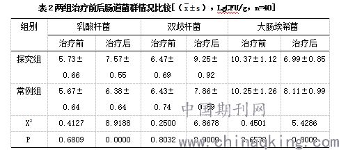 对比两组治疗前后肠道菌群情况,菌群分类:双歧杆菌、乳酸杆菌以及大肠埃希菌。