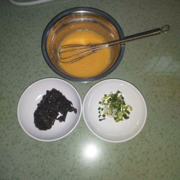 第4步、用打蛋器把鸡蛋打成蛋液备用,小葱切葱花装小碟子备用,紫菜装小碟子备用。