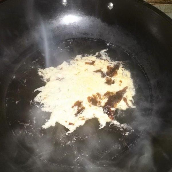 第7步、下鸡蛋液,加鸡精,迅速搅均匀。