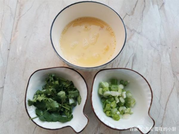 2.鸡蛋磕入碗内,搅打均匀,葱切葱花,香菜切小段。