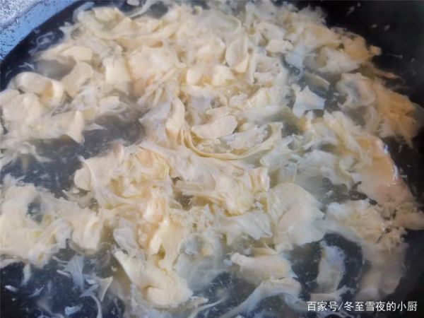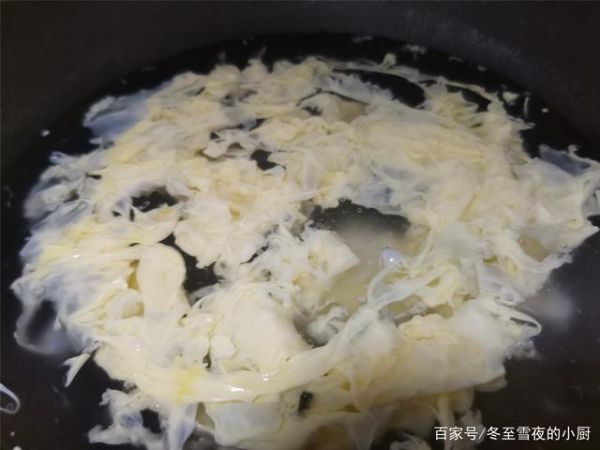 2.淋鸡蛋液时,要关小火,使汤汁保持微开,再淋鸡蛋液,这样做出蛋花漂亮,而且汤清澈不浑浊,用大火,淋入鸡蛋液后,会起浮沫,汤汁也会变得浑浊,而且,蛋花也不成型。