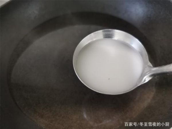 4.把淀粉放入碗内,加入半碗水,搅匀,调成水淀粉,锅内加入水,把水烧开,淋入水淀粉,淋水淀粉后,用勺子在锅内搅动。