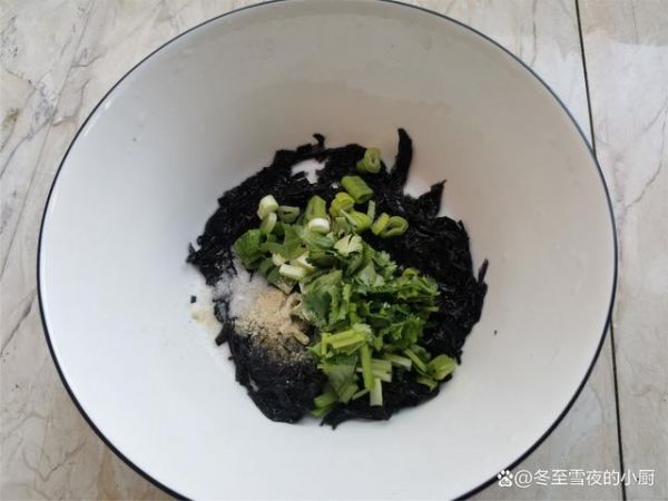 1.把紫菜撕成小块,放在大碗内,加入温水浸泡1分钟。