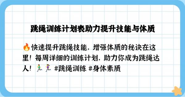 跳绳训练计划表旨在通过科学的训练方法,帮助学生提高跳绳技能,增强体质。以下是一个详细的跳绳训练计划表示例: