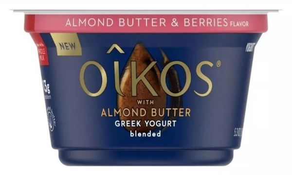 Oikos扁桃仁酱希腊酸奶将全脂酸奶和扁桃仁酱混合在一起,每5.3盎司杯装可提供13克蛋白质。