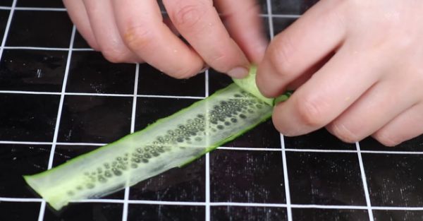 4、接下来咱们将黄瓜切掉的顶端用削皮刀削成长片,然后将其摆放到盘中,也是要摆放成一圈,摆好之后咱们先将黄瓜放到一旁,然后看一下鸡蛋有没有煮熟。鸡蛋煮熟之后咱们将其取出来放到凉水中泡凉,泡凉之后剥掉外壳。