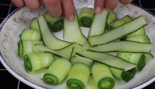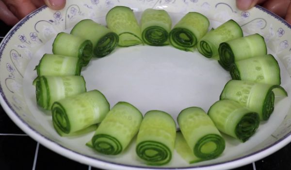 2、黄瓜要卷得稍微细一点,摆得整齐一点,好看一点。