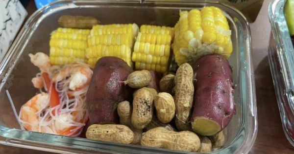 这是一盒粗粮主食,全都是一些水煮食物:一根水煮黄玉米、少许水煮花生和一些蒸红薯,几个鲜虾仁拌了几根粉丝。个人认为其实虾仁可以用调料蘸着吃,或者用调料和粉丝凉拌一下,这样看起来会更加入味。很多粉丝看到后,纷纷留言道:这样的饮食,如果是我不蘸料,我肯定是吃不下去的。