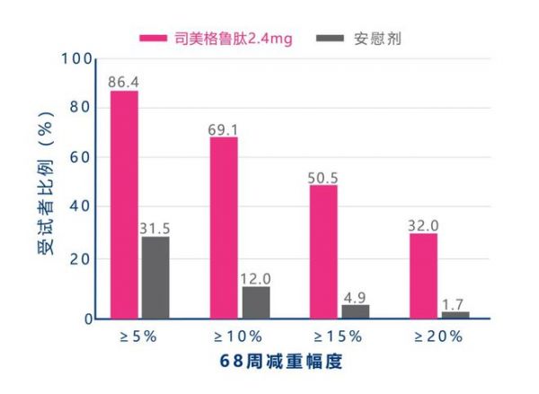 图 司美格鲁肽(减重版)组达到不同减重幅度的受试者均显著高于安慰剂组