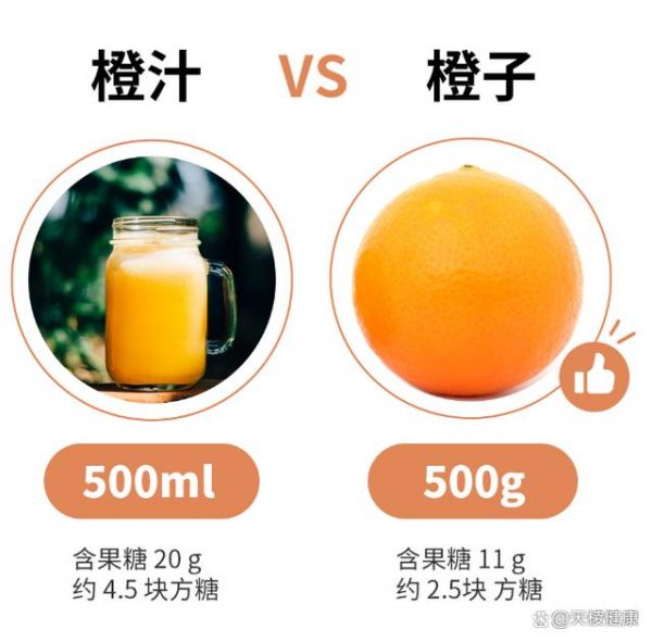 举个例子,500 克橙子里面含有约 11 克果糖,要啃半天,还很容易有饱腹感。但一瓶 500 毫升的橙汁饮料里,大约含有 20 克果糖,几口就能喝完了。