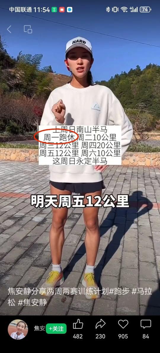 焦安静产后复出一年多,体重从刚开始的170多斤减到了如今的108斤,期间还刷新了全马PB。她透露,现在的月跑量大概500-600公里,还会慢慢提升,她的目标是要把全马的PB提升到2小时30分以内。焦安静曾在她的微信视频号中晒出了她推荐的训练计划,其中包含了有计划的跑休。也就是说即使月跑量高达500公里以上,跑休也必不可少。