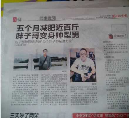 2014年5月武汉三个月减肥班学员严钦登上楚天都市报,新浪湖北,腾讯大楚网等成为武汉健身减肥的楷模 [2]