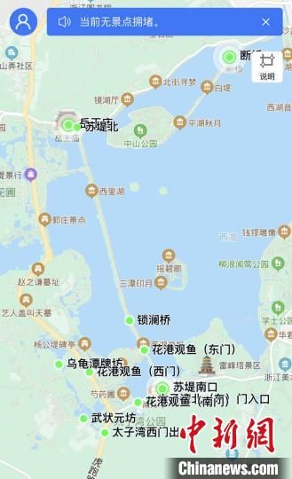 小程序还试点推出了13个点位畅通、拥堵的提示,为准备游览花港、苏堤、岳庙、九溪等景点的游客解决出游困扰。如在花港公园内,设置了多处客流量点位,绿点代表畅通,红点代表拥堵,计划游览这些公园景点的市民游客,可以提前在手机上查看客流情况后,再选择合适的目的地前往。(完)