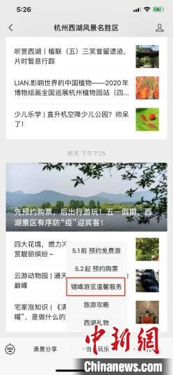 据悉,游客搜索“杭州西湖风景名胜区”微信公众号,点击“错峰游览温馨服务”即可进入小程序,获取错峰旅游路线。
