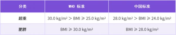 表 1 WHO 和我国关于超重/肥胖的 BMI 诊断标准[2]