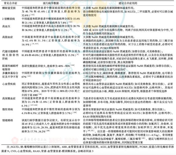 目前,肥胖症常见的并发症包括:糖耐量受损、T2DM、高血压、血脂异常、代谢功能障碍相关脂肪性肝病、阻塞性睡眠呼吸暂停综合征(OSAS)、多囊卵巢综合征(PCOS)、不孕不育、高尿酸血症、慢性肾脏病(CKD)、情绪障碍等[2]。《肥胖患者的长期体重管理及药物临床应用指南(2024 版)》强调,针对伴有合并疾病的肥胖成人,减重药物的选择应充分考虑这些疾病的影响[3]。