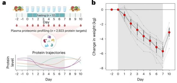 参与研究的12名志愿者中,包括5名女性和7名男性,禁食的7天内只能喝水。禁食开始前两天、禁食期间每天和恢复饮食3天后,研究者会给志愿者采集空腹血用于蛋白质组分析,囊括了2923个蛋白质。