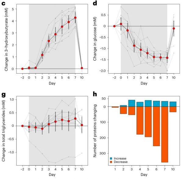 近期,柏林Charité健康研究所的科研团队在《自然·代谢》杂志发文,研究者们分析了12名志愿者完全禁食7天前后体内的近3000种蛋白质变化,发现其实禁食前3天蛋白质组变化竟然并不大,而在后期出现的部分蛋白质变化则指向了对类风湿关节炎和冠心病等疾病的有益改变。