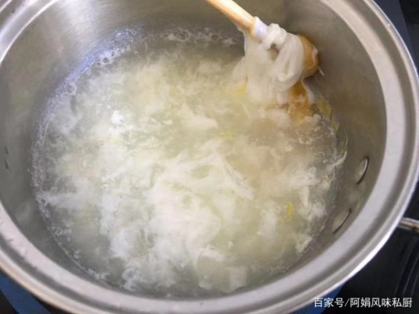第四步:等糖在锅中熬化了会后,我们就可以将准备好的鸡蛋打散,沿着锅边慢慢的倒入锅中,这样是为了形成蛋花不会出现一坨的现象发生。