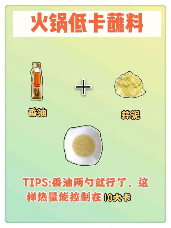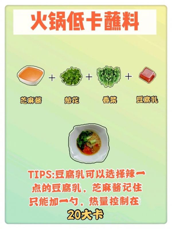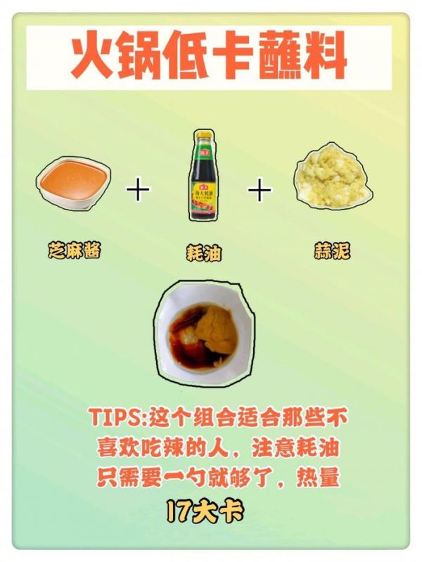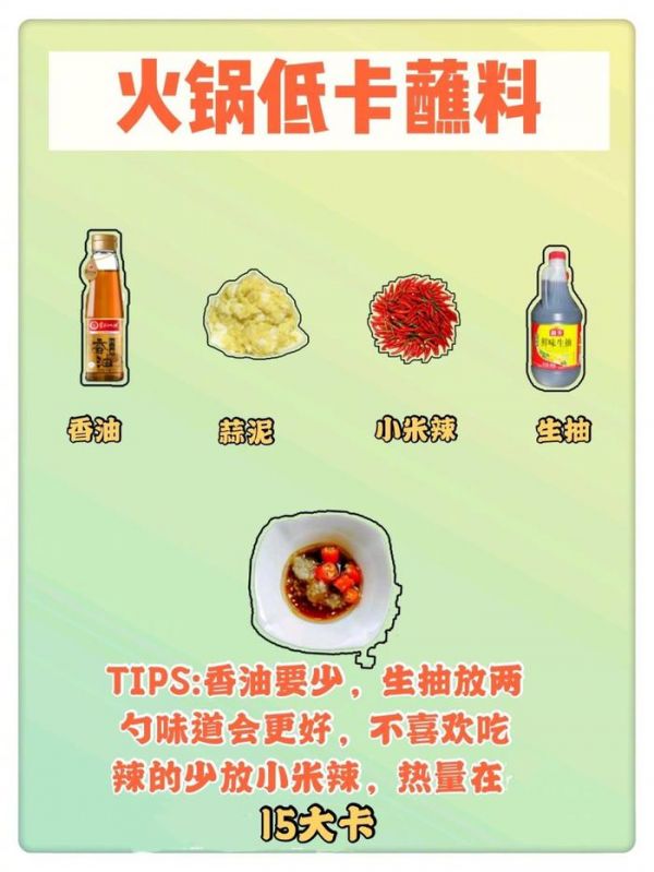 3 / 6 大家总是抱怨吃了火锅胖三斤,是因为火锅菜系拥有巨大的热量,再加上美味的蘸料,一吃就停不下来了。其实很多时候我们往往只看到了火锅,却忽略了蘸料热量也是巨大的。所以上面大喵就给大家列举了一系列低卡蘸料的搭配方法,希望大家在吃的开心时也不会长胖!大喵爱上树