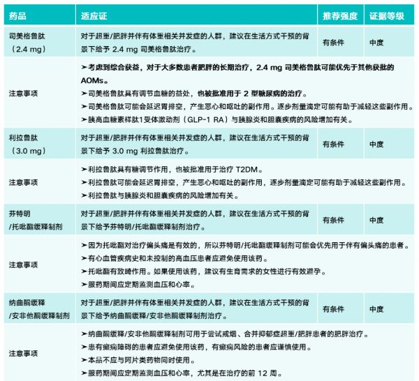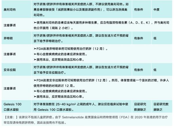 美国胃肠病学协会关于肥胖症管理的药物干预整理建议如下 [8]