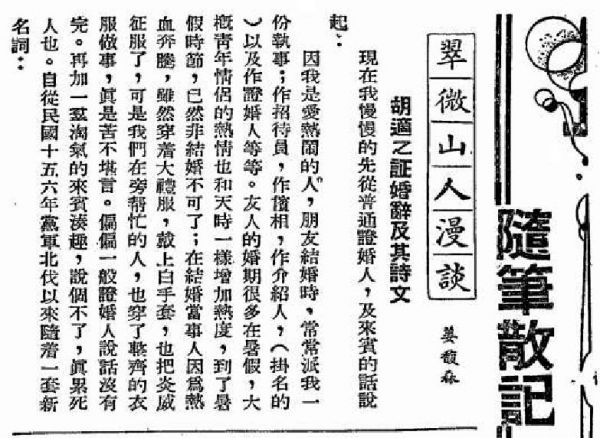 姜馥森何许人也?据考,姜馥森又名“姜树琳”,曾为华北中学教务主任(其季父姜梅坞为该校校长)。除却此篇记述胡适证婚事迹的文章,还多有撰发漫谈学者作家生活的散文随笔,诸如谢冰莹、章衣萍、沈从文等,都曾付诸笔下,以“翠微山人漫谈”的总题,接续发表于 1937年《实报半月刊》的“随笔散记”栏目。因此,可以将姜氏视为该刊的专栏作者。
