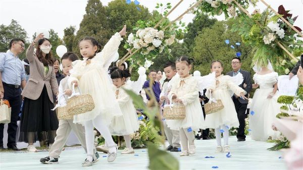 14点38分,伴随着悠扬的音乐,35名协和医院医护人员的孩子组成花童天团,为新人们幸福“导航”。百名新人在长辈的陪伴下,穿过鲜花拱门,缓缓步入婚礼会场。新郎握住新娘的手,单膝跪地倾诉爱的诺言,新人互相交换戒指,许下爱的誓言。