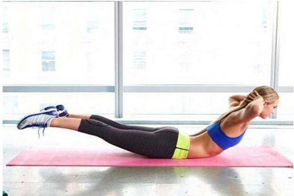 腹部着地,双手伸向前方,同时双手双脚向上伸,在最高点处停留几秒钟,再慢慢将指尖和脚尖放到地板上。如此重复10至12次,注意放松背部。