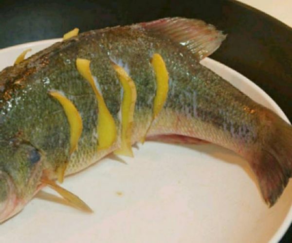1、将鲈鱼清理干净,然后再正反面各划开刀口,涂抹料酒和盐巴,撒入生姜片