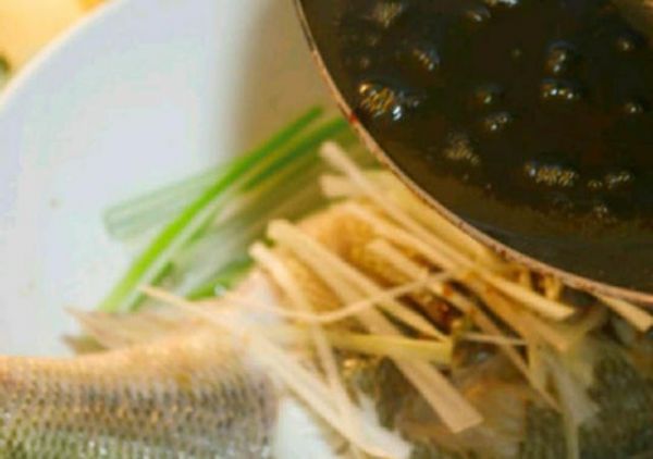 另找一口干净的锅,用滚烫的热油和鱼露调和酱汁,再取出蒸好的鱼将酱汁淋在上面,鲜嫩美味的清蒸鲈鱼就完成啦。
