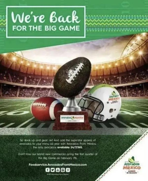 2015年墨西哥牛油果公司买下了半分钟“超级碗”广告。