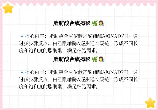 脂肪酸合成是一个复杂的多步骤代谢过程,需要多种酶和辅酶的参与,乙酰辅酶A和NADPH是其中最重要的原料。通过这一过程,生物体能够合成不同种类和长度的脂肪酸,以满足细胞和机体的需求。