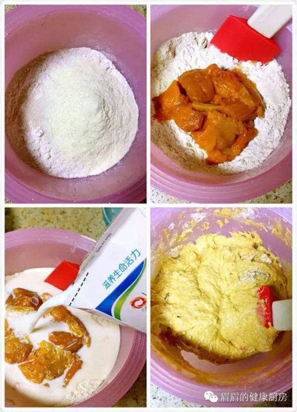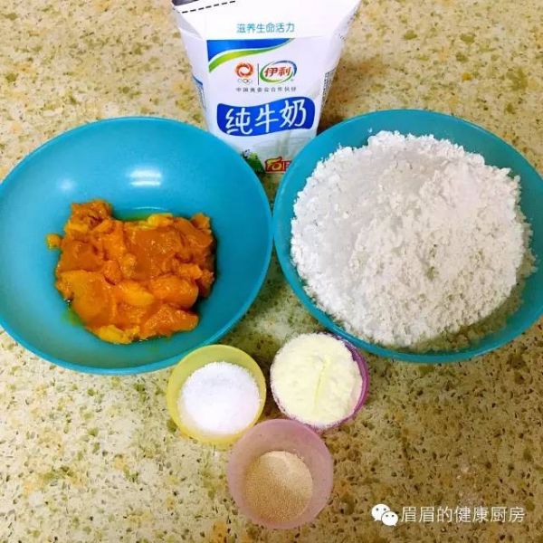 【材料】蒸熟的南瓜泥150克,面粉250克,纯牛奶约100克,酵母5克,奶粉1精灵杯(减肥期间食用为减少热量可以不用加奶粉),木糖醇1精灵杯