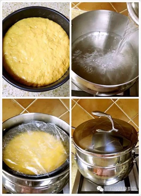 3、取一个容器,内壁涂上适量植物油防粘,然后将搅拌好的面糊倒入容器中,将容器放桌面上震几下,使面糊表面平整,再在容器上封上保鲜膜,放在温暖的地方进行发酵,发酵的适宜温度在30度左右,湿度在80%左右,如果冬天室温较低的情况下,可以在多用锅内加入一些热水,然后放上蒸屉,将装了面糊的容器放在蒸屉上面,再盖上锅盖,这样多用锅内的温度和湿度都会升高,大致能够达到发酵所需的状态,如果热水冷却了,发酵还没有完成,可以更换一次热水,使面糊发酵至两倍大即可;