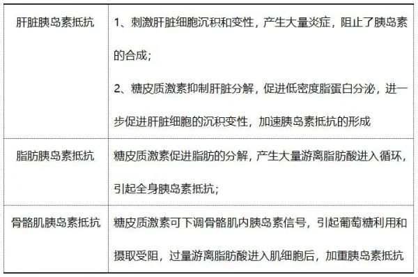 其中上述的病例患者为垂体依赖性库欣,胰岛素抵抗为该病常见的表现之一。主要在于垂体刺激肾上腺素大量分泌血皮质醇,增加了糖异生及肝糖原输出,拮抗了胰岛素的作用。糖皮质激素主要作用的器官为肝脏、脂肪及骨骼肌: