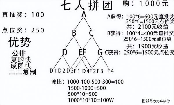 模式举例:平台设定直推奖100元、点位奖250元;A购买团购商品,参与拼团;A推荐B、C、D、E、F、G等6人购买商品,此时七人拼团成功,A可以出团;A推荐了6个人,获得100*6=600元直推奖;A出团获得点位奖,6个点位奖是固定的,6*250=1500元;A最终获得600+1500=2100元。