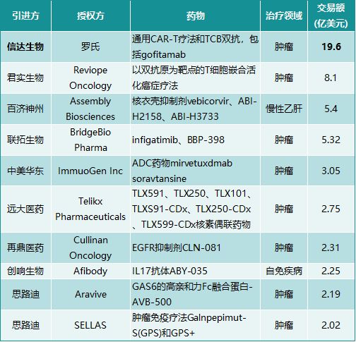 创新药企业之间合作的重要性凸显创新药研发与商业化的核心之一是与时间赛跑,而不是“做时间的朋友”。有未满足临床需求的患者无法等待,有投资收益压力的资本不能等待,还有奋力推进开发的竞品必须超越。既然创新药唯快不破,那么如何加速?最显而易见的是培养内生增长动力,加强自身研发和商业化能力。海外人才的大量回归,跨国药企人才向本土药企的频繁流动,以及企业人员规模的不断扩充都是行业加快内生增长的明证,但是人才的招募、团队的磨合、管线的搭建是一个长期持续的过程。因此,国内众多biotech在发展的早期阶段选择与CRO/CDMO合作,以期减少投入的资本和/或时间。新生代biotech的涌现催生了中国CXO行业的繁荣,然而biotech在羽翼渐丰后逐渐减弱对CXO的依赖,从而更好地平衡成本和收益。在2021年半年报中,百济神州强调研发不借助CRO(CRO-free),信达生物、君实生物和康方生物也都提到已拥有和在建的强大产能。在对CXO的依赖减弱后,biotech的相互合作及biotech与big pharma之间的合作日益增多。随着国家医保谈判加速仿创新药(me-too)的迭代,以及政策强调新药研发以临床价值为导向,创新药的竞争不再是me-too药物开发思路下单纯追求速度,未来对于品种及赛道的筛选与竞合日益凸显。在这种情况下,国内外biotech和big pharma之间将通过合作,迅速聚焦于更具临床优势的品种,或者快速切入竞争格局更好的赛道。国内外药企之间“连横”的利弊与概况在中国创新药研发热潮下,前几年中国药企,尤其是传统药企争相前往海外抢购创新药项目,催生了估值泡沫化,提升了后续引进的难度。2020年新冠疫情带来的社交隔离,也在某种程度上影响了海外项目的引进。中美关系的紧张导致对项目投资的审批趋严,对创新药项目的跨国授权产生了一定影响。多种因素的作用使得国内药企之间的“合纵”成为当前形势下的合理选择。国内外创新药企之间通过引进或转让实现“连横”,加快了国内药企国际化的进程。双方可以合作进行全球多中心临床开发,实现中外双报,一方面推动国内药企的研发水平提升,实现与国际接轨;另一方面创新药产品在发达国家获批上市后,可利用国外合作方的营销团队和渠道,加快创新回报速度。当然,“连横”的困难也是无法回避的,最直接的就是国际化研发对于费用和能力要求更高。此外,中外在政策法规、市场准入、患者群体等方面也存在诸多差异。国内外创新药企之间的“连横”主要为授权合作,既有引进来(license-in),也有走出去(license-out)。对于引进来,国内药企(主要为biotech)引进国外药企(主要为biotech)的早期研发项目,利用中国基数较大的患者群和相对较低的研发费用,快速推进研发,上市后通过谈判进入国家医保,从而快速放量。当然,也有的国内企业在将引进项目推进到临床后期,获得较好的数据之后,再授权给国外企业。2020年6月,信达生物与罗氏达成战略合作,信达生物将为其使用罗氏技术开发2:1双特异性T细胞抗体和通用型CAR-T平台而支付首付款、开发和商业里程碑款以及产品销售提成,总计约19.6亿美元。此项交易创下2020年国内企业授权引进创新药的最高记录。图表2. 2020年国内药企引进(license-in)项目交易金额top 10