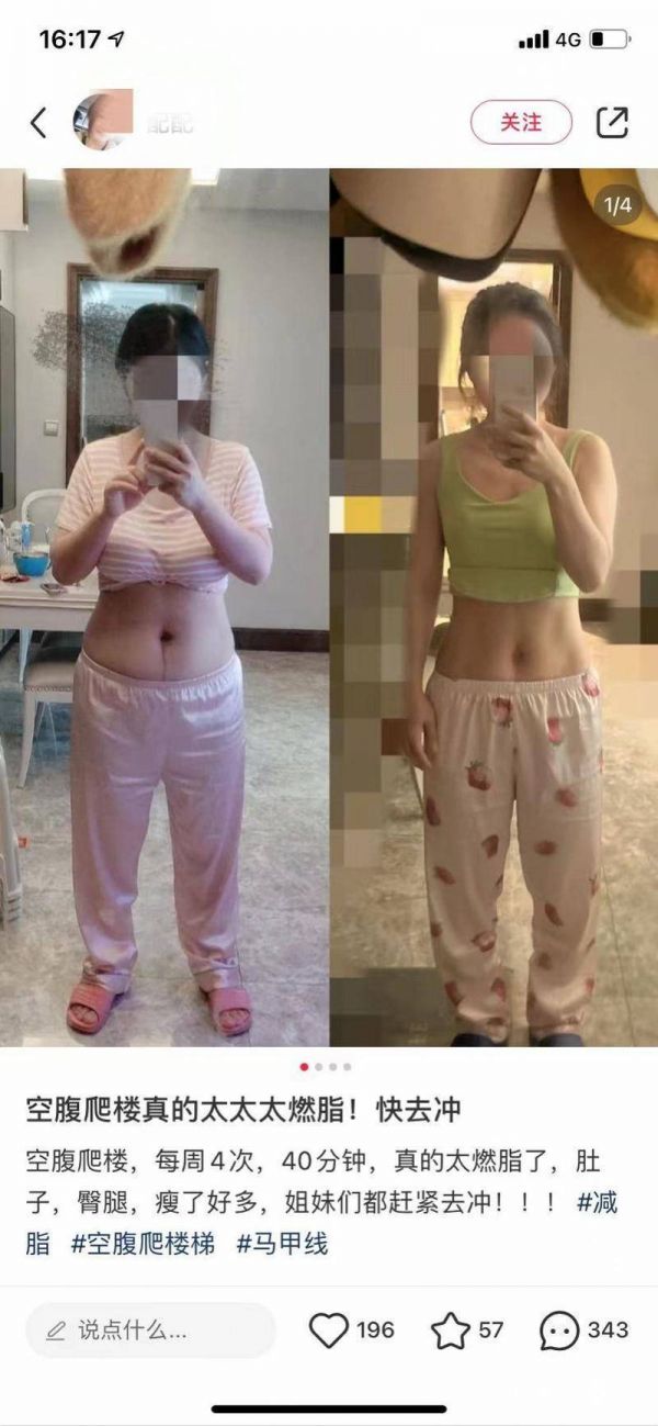 一名网友晒出自己减肥前后对比照,肚子和腿瘦得尤其明显,自称空腹爬楼梯帮助自己“20天瘦了15斤”“34天瘦了19.5斤”,每周坚持4-5次,每次45-60分钟,大概爬120-160层。他分享经验,爬楼梯之前会热身,爬完选择坐电梯下楼,爬楼梯前会喝点白水、牛奶或黑咖啡。