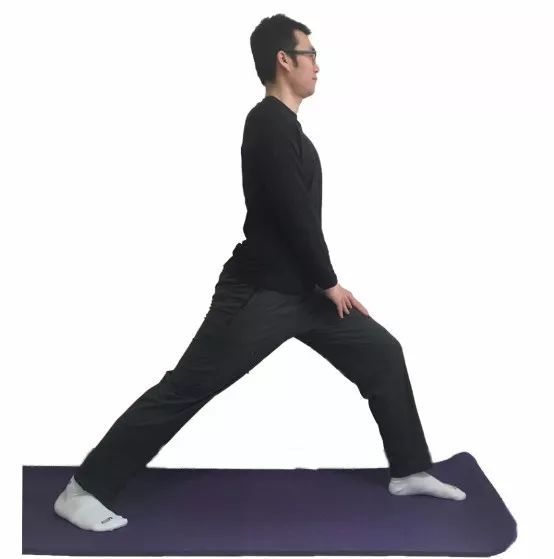 动作:右脚向后跨一大步并伸直腿,同时脚跟用力踩住地面。左腿成弓步,身体保持直立,面向前方,保持20~30秒,回到原位,再换另一侧。