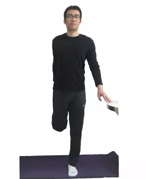 起始位:立位,收腹挺胸,直视前方,双脚分开与肩同宽,一手扶住固定物体。