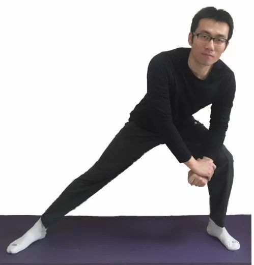 动作:双脚开胯站立,右脚带动右腿向右侧伸出;左腿同时屈膝,尽量放低髋部。同时把手靠在弯曲的大腿上。保持20~30秒,回到原位,再换另一侧。