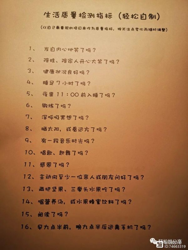 每个人都可以按照自己的喜好和特点来制作自己的生活质量检测指标。定时检测一次,起码让自己做到心里有数,感觉不达标的时候赶快作出修正,尽快改进。